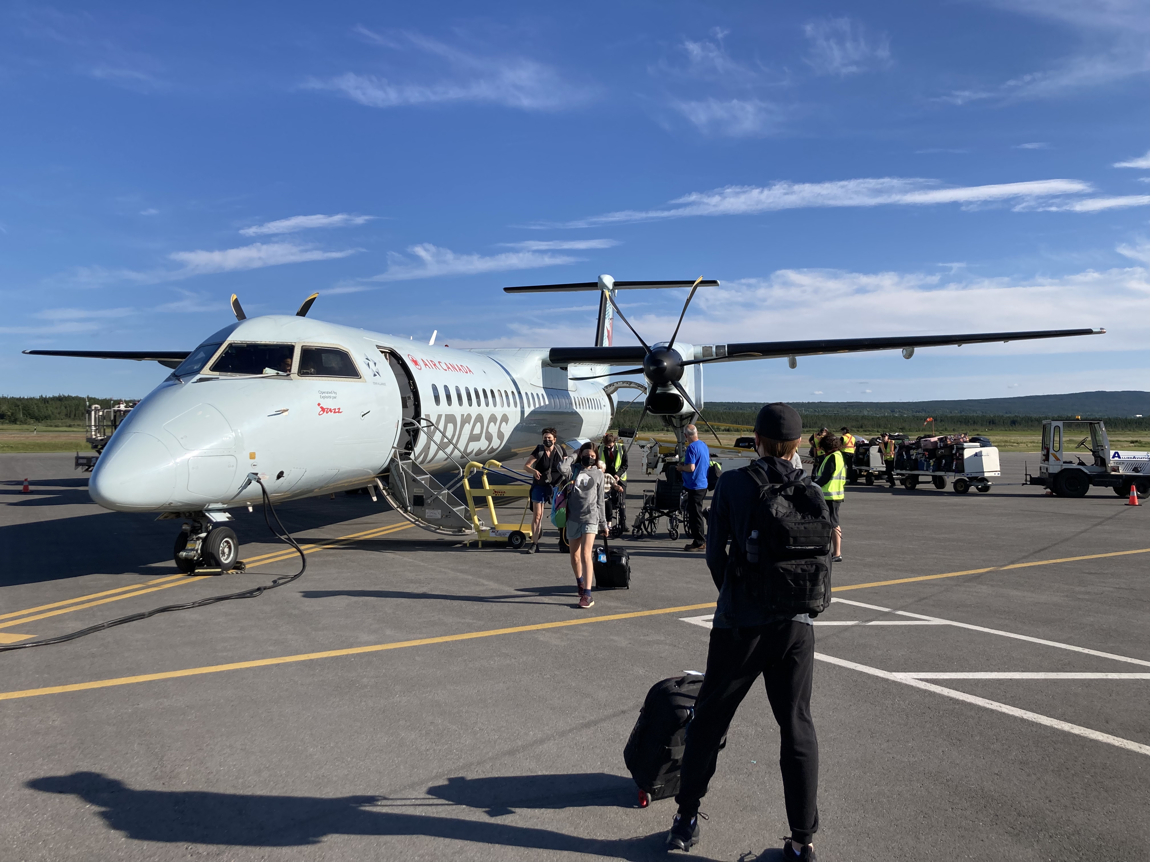 Finalement, un avion de remplacement pour notre vol arrive. Un Bombardier Q400 (moins cool avion mais quand même cool). Nous embarquons dans ce coucou de l'air et poussons fort pour faire rentrer nos bagages de cabines dans l'overhead pas mal plus petit. Une fois arrivés à Deer Lake ("chevreuil-lac" pour Mutti 😬) après un atterissage super rough, nous n'avons aucun problème à récupérer la voiture que nous utiliserons pour le reste du séjour. Un GM Equinoxe avec 10,000km au compteur. Très propre. Avec WiFi. Bicoz why not.