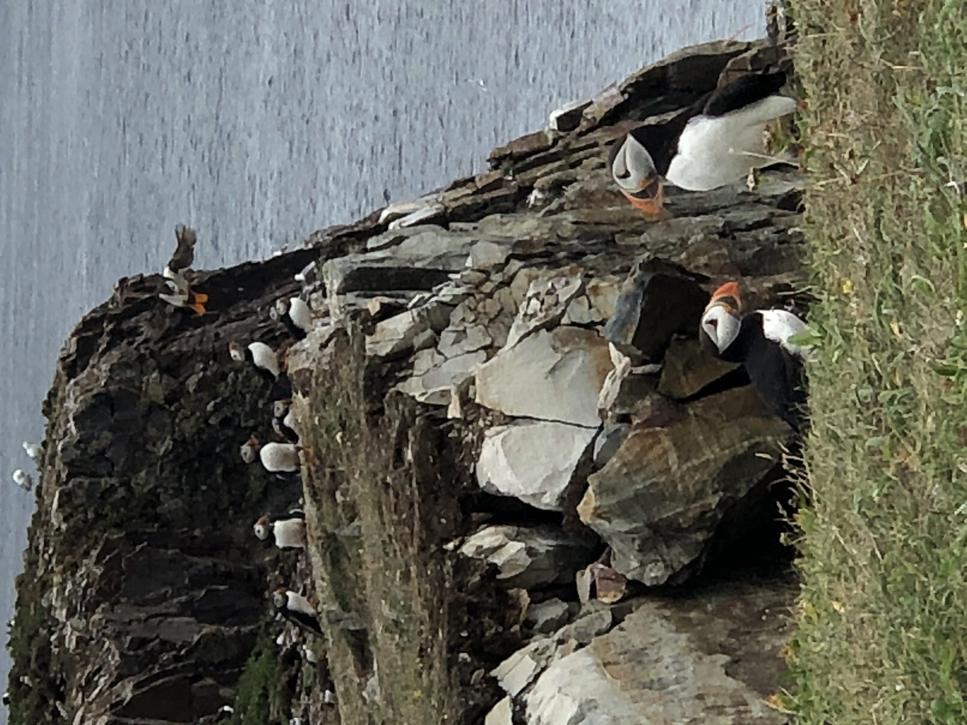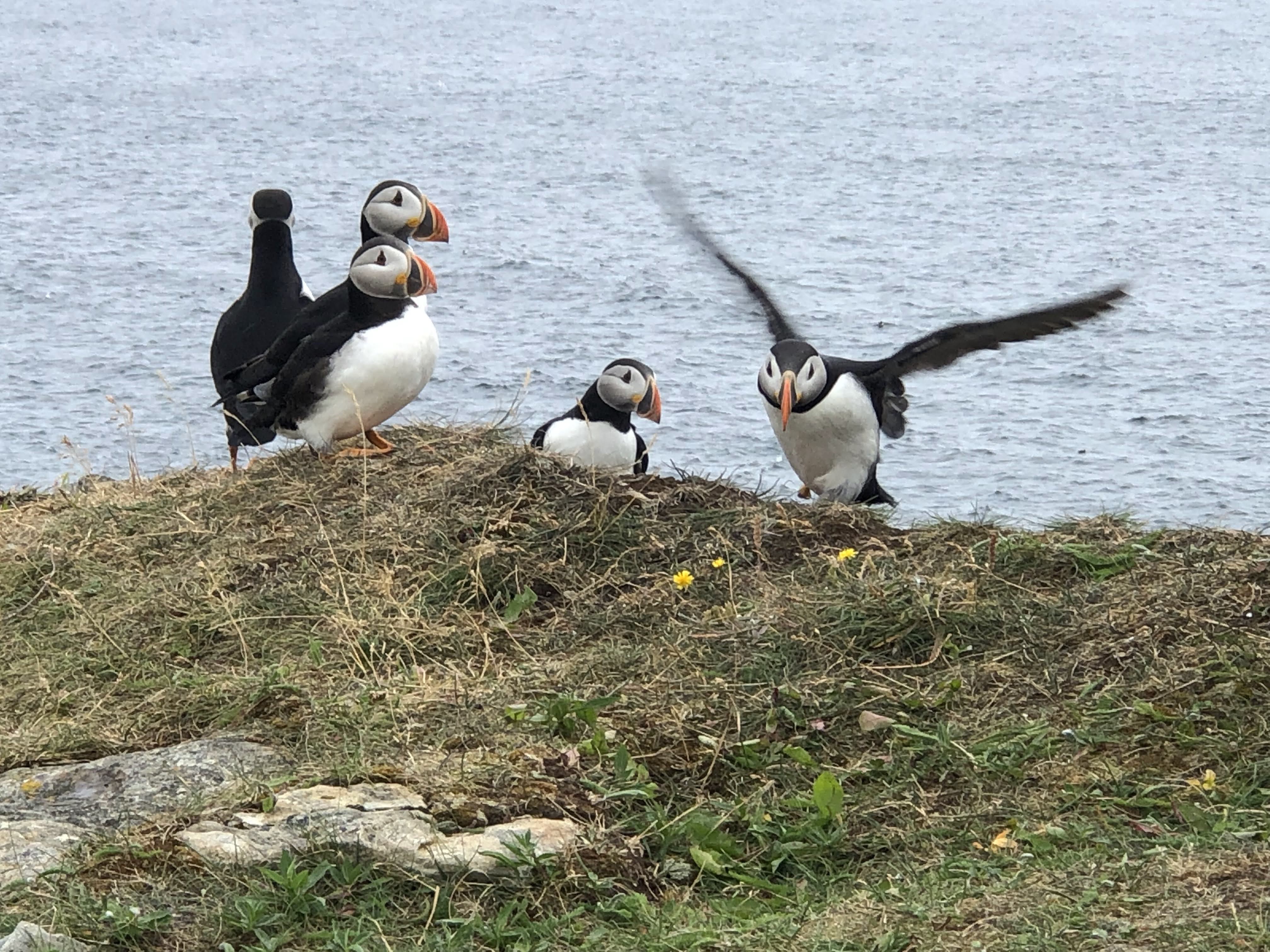 Avant de rentrer, on craque et on retourne voir les Puffins. Ils sont cette fois-ci bien affairés à nourrir leurs petits en évitant de se faire prendre leur prise par les mouettes qui guettent le moindre poisson pris dans leur bec alors que ces braves pingouins tentent de retourner au nid après une pêche éclair.
