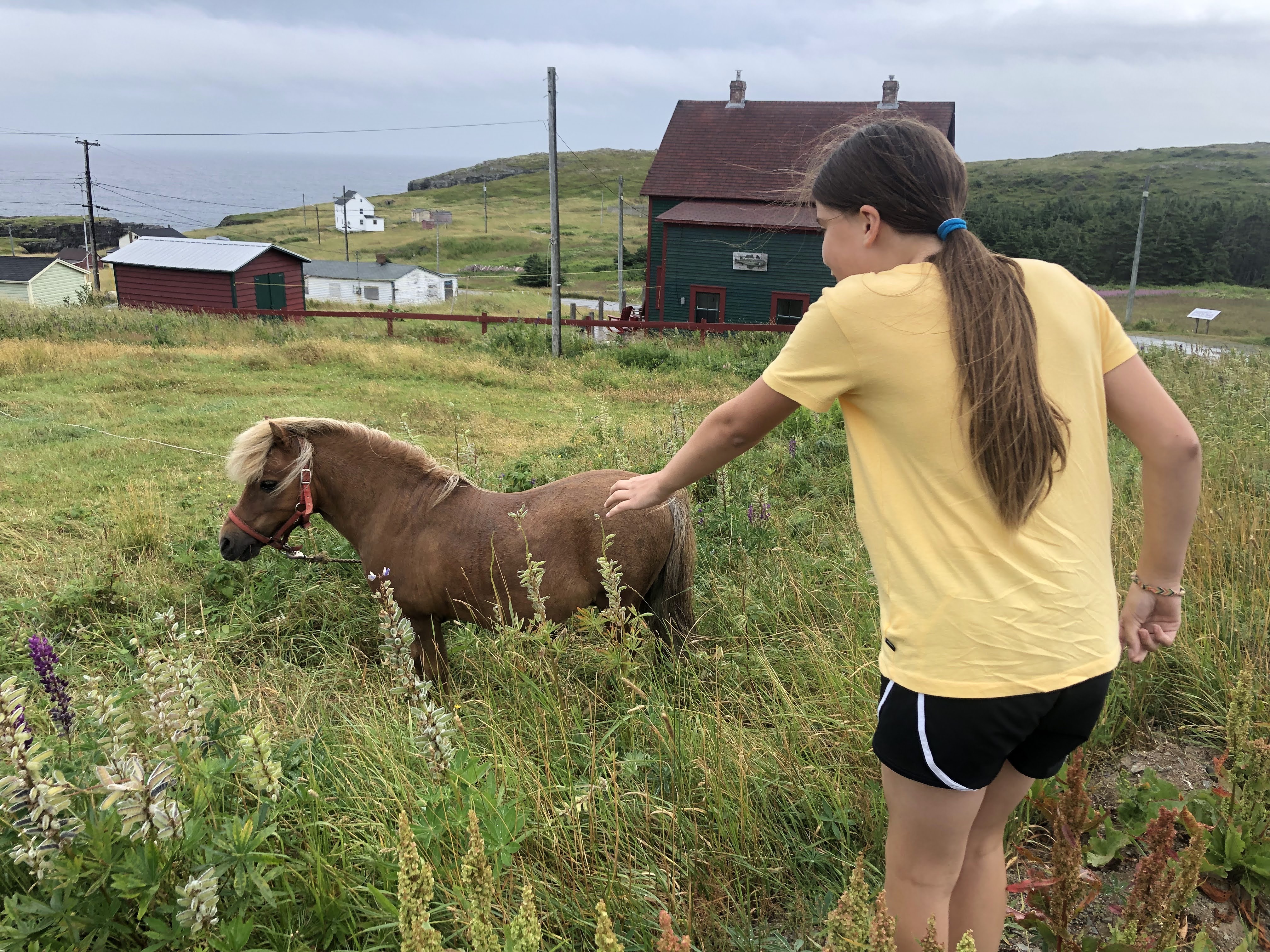 On s'arrête quand même 30 secondes après car Charlie voit un magnifique poney de Terre-Neuve qui sont - semble t-il - en voie de dispratition, du coup il faut aller le flatter. On repart après qu'elle a failli se faire mordre. Pas super sympas les poneys de Terre-Neuve.