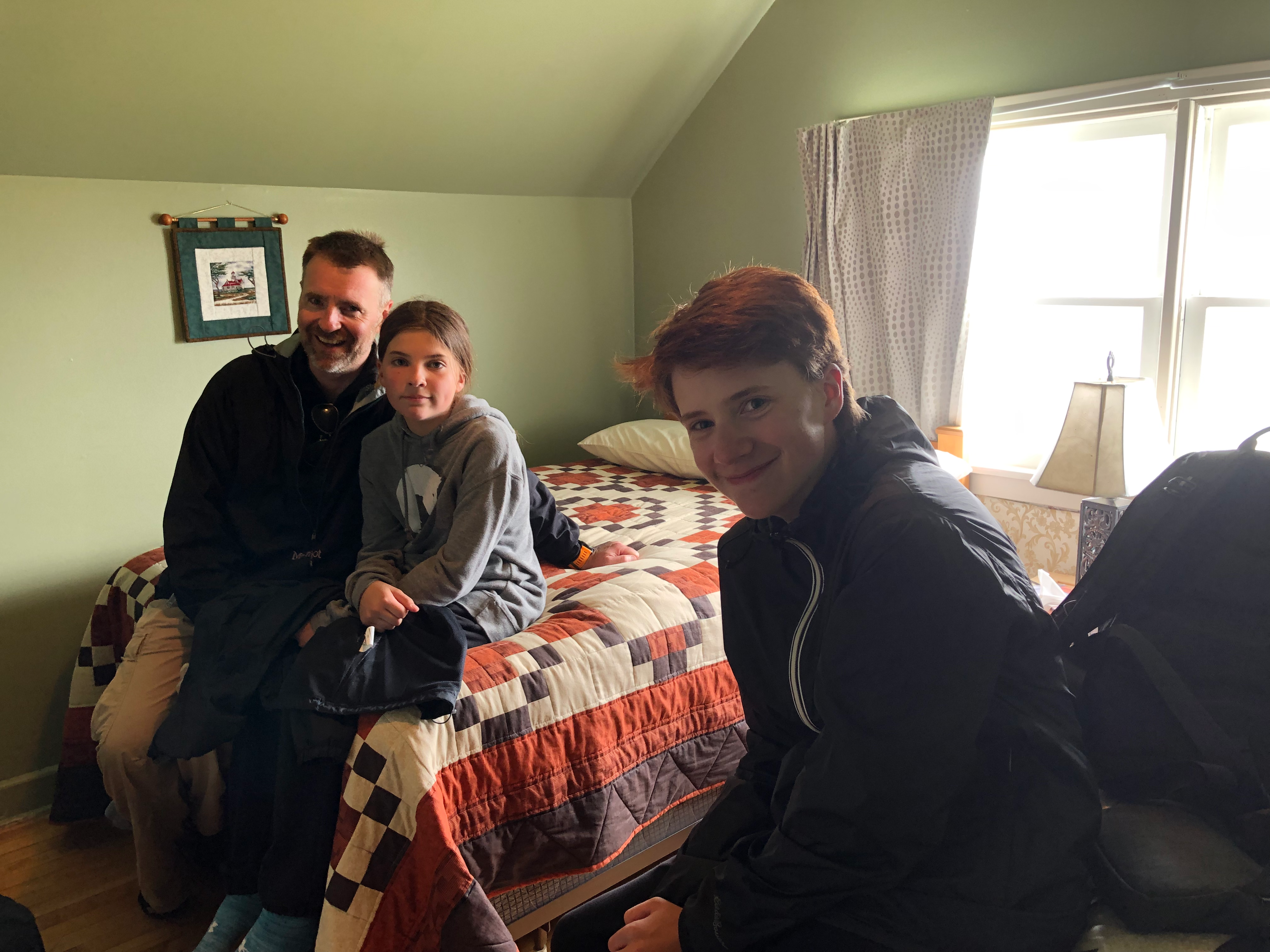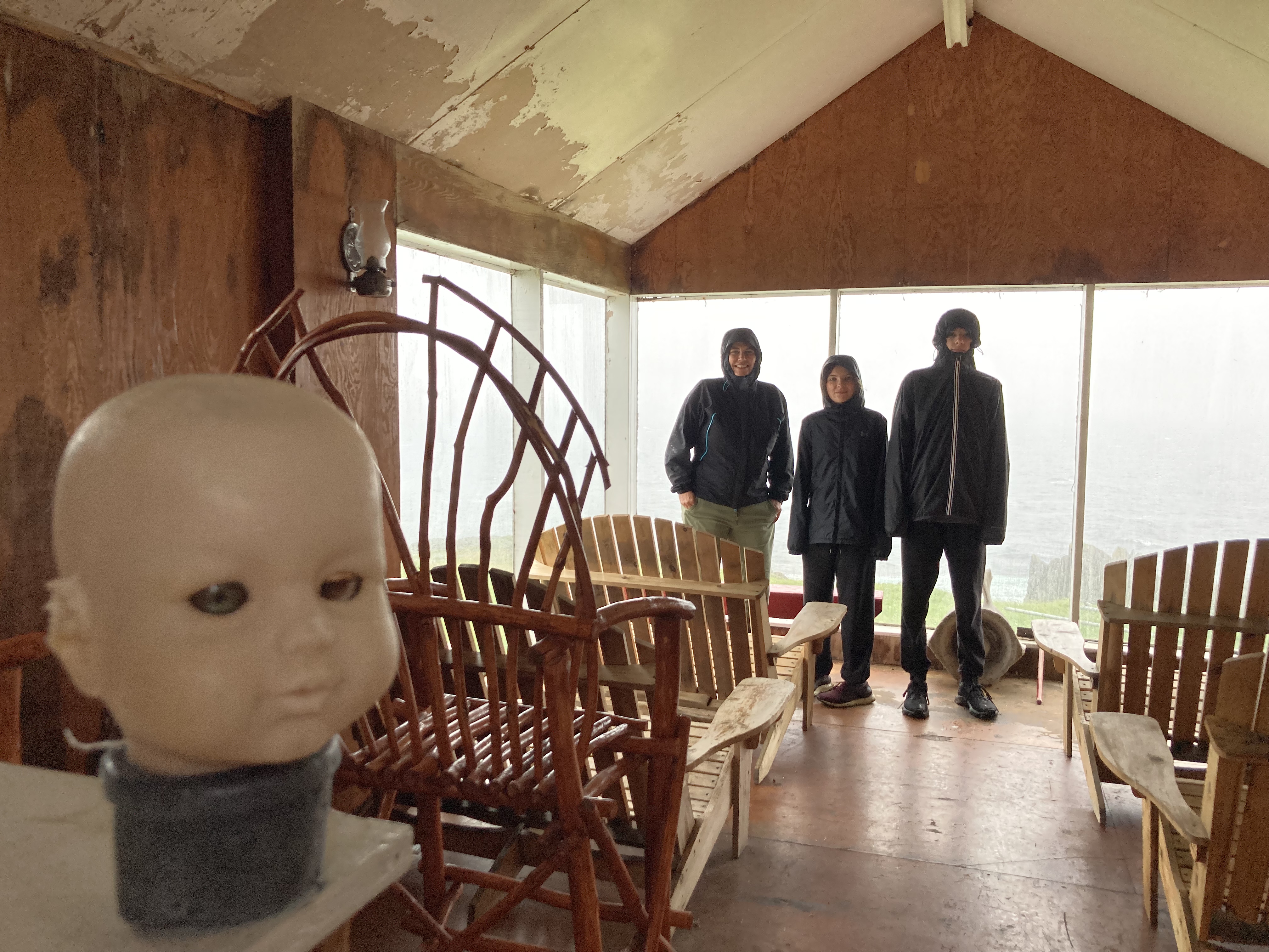 Rendus au Lodge, nous sommes informés, via un papier sur la porte que notre petite cabane est située plus bas dans la colline, mais qu'il faut quand même appeler à partir du téléphone rouge dans le couloir. Air BnB façon Terre-Neuve. On hérite d'un petit shack à deux étages, avec un plafond anormalement bas (dépendamment d'où est papa dans la pièce, il touche -ou pas- le plafond avec sa tête. Comme un vrai Viking) ainsi qu'une magnifique vue sur le golfe du Saint-Laurent. C'est vraiment cool. Papa allume un feu car il fait super froid. Et dans quelques heures, nous irons manger. Nous vous tiendrons au courant!