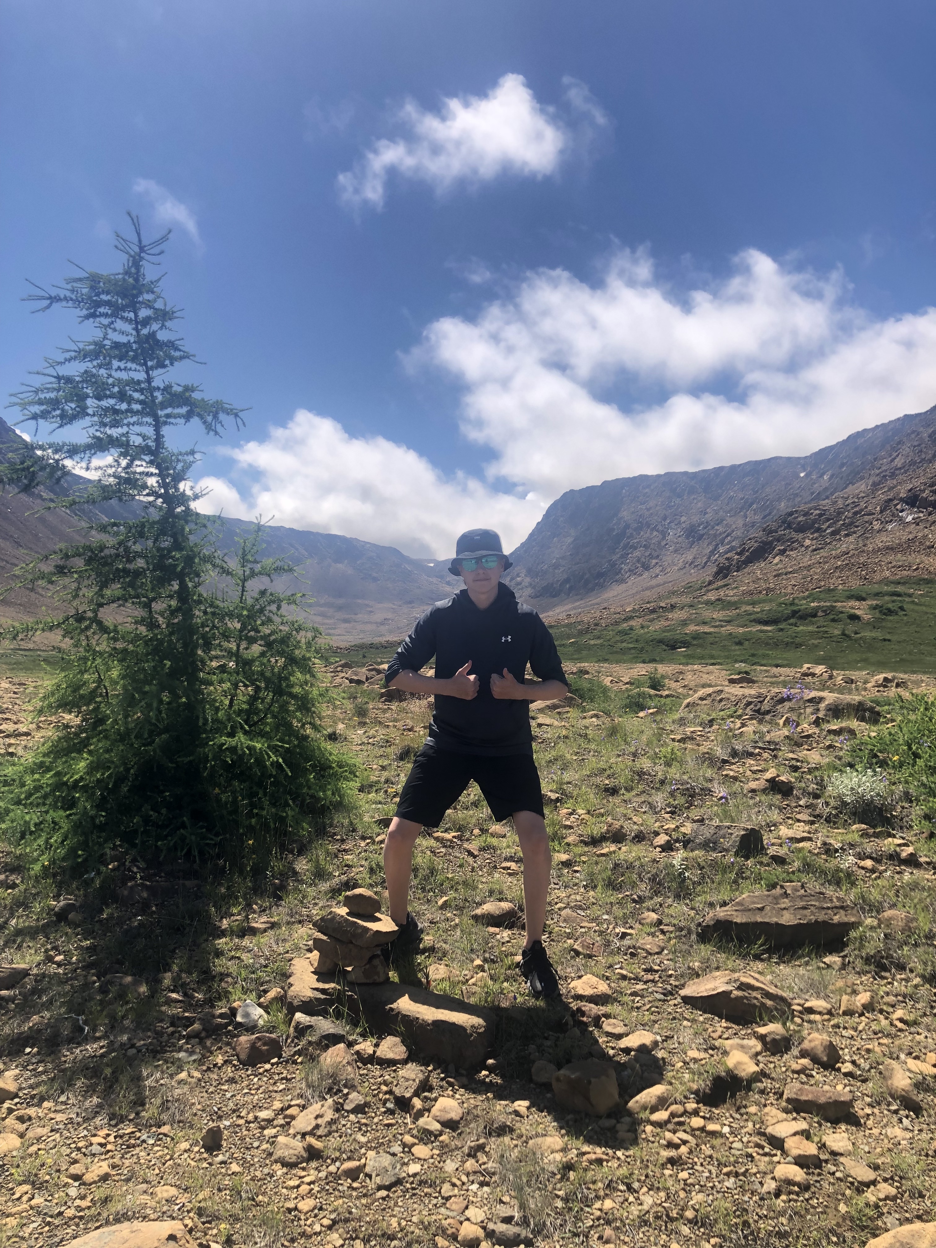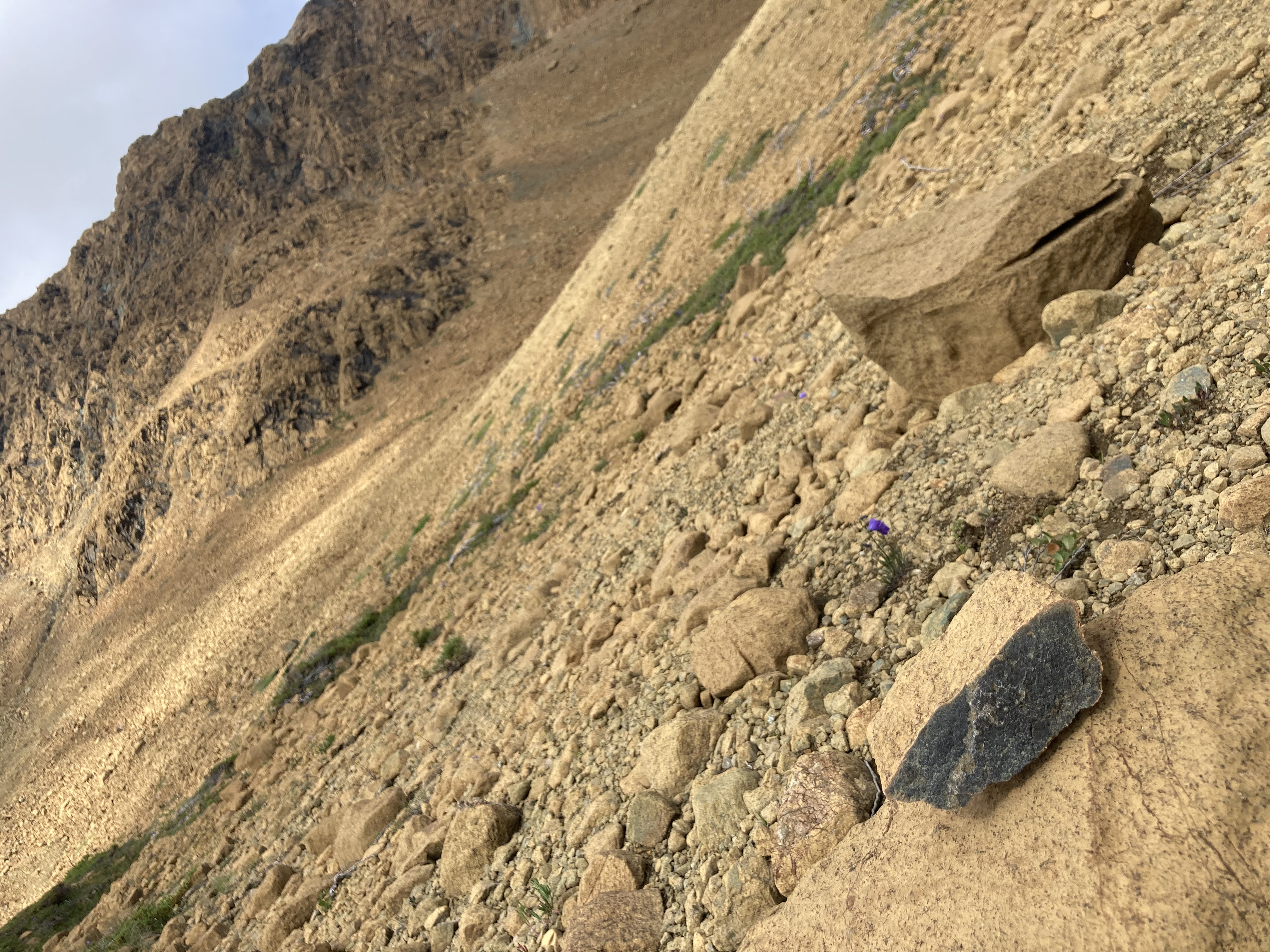 Nous avançons donc jusqu'au bout de la randonnée balisée par Parc Canada et décidons (après que j'ai insisté à maintes reprises) d'aller explorer le relief de la vallée de l'ancien glacier. Plus haut en altitude, d'immenses cirques laissent encore paraitre de grosses patchs de neige, en plein mois de juillet à 30 degrés. Ces fameuses roches ocres de toutes tailles tiennent leurs couleurs de l'effet de l'oxydation. Puisque nous marchons directement sur le manteau terrestre, qui est donc principalement composé de fer, manganèse et autres métaux primaires, celui ci, au contact de l'air et de l'eau, s'oxyde et adopte cette couleur orangée. L'intérieur de ces roches, lui, puisqu'il n'a pas été en contact avec l'air ou l'eau, est d'un vert tirant vers le noir intense. Contemplez vous-même: